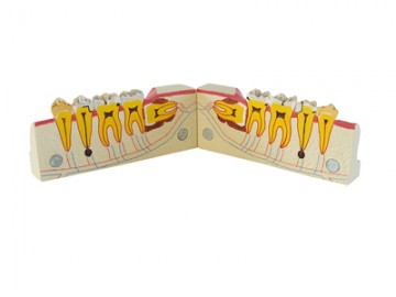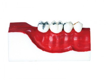 2倍自然形態大小,右下后牙近遠中垂直分解模型。展現阻生牙,膿腫,健康和病態的牙髓和正確與不良的棄填.