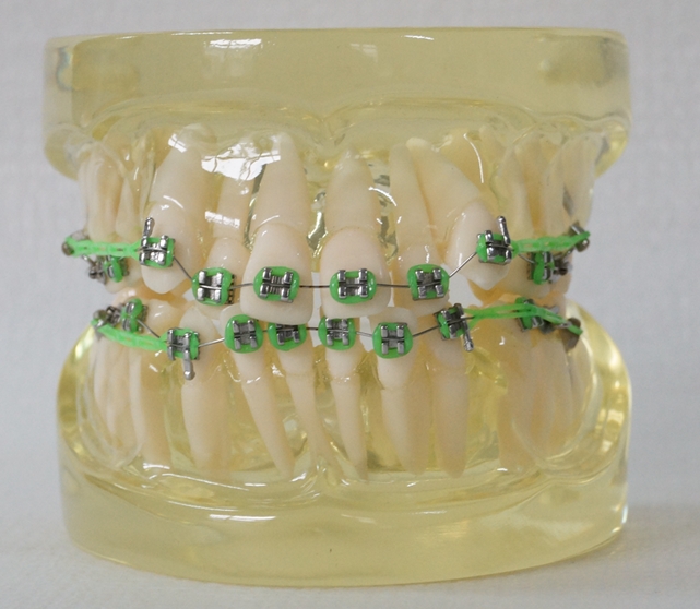 金屬托槽是指通過粘接劑將矯正托槽粘固于牙面頰側,通過矯正弓絲與牙上的矯正托槽施加力量進而矯正牙齒。這種托槽患者不能自行取下。目前世界上應用較為廣泛的金屬托槽是直絲弓托槽(Straightwire appliances),因其使用的醫生居多,應用甚廣,因此在各方面的矯治功能也較完善。
